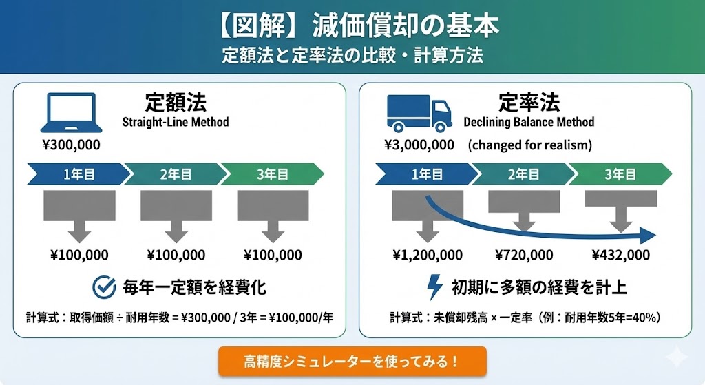「今年の減価償却費、いくらになるんだろう?」「定率法と定額法、どっちが得なの?」 そんな疑問を解決するために、最新の税制に準拠した高精度シミュレーターを用意しました。