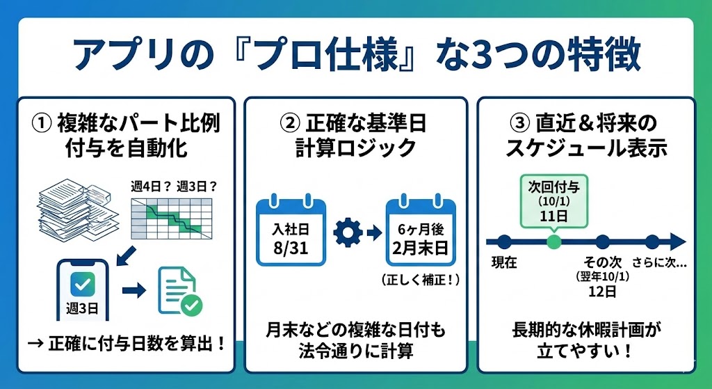 今日の日付を基準にして、「次にいつ、何日付与されるのか」を一番目立つ場所に表示します。さらに、その後の将来にわたる付与スケジュールもリストで表示するため、長期的な休みの計画を立てるのにも役立ちます。
