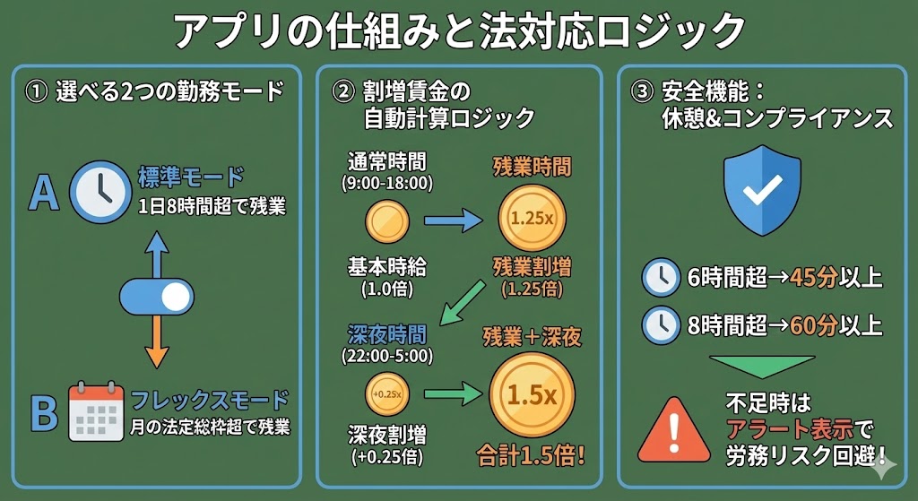 世の中には単純な時間計算アプリは多いですが、このツールは**「日本の法律(労働基準法)に則って正しく計算できること」**に徹底的にこだわって設計されています。