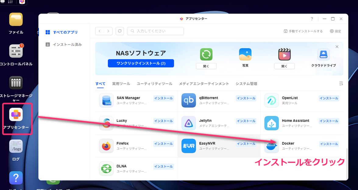 - アプリセンターからDockerをインストール