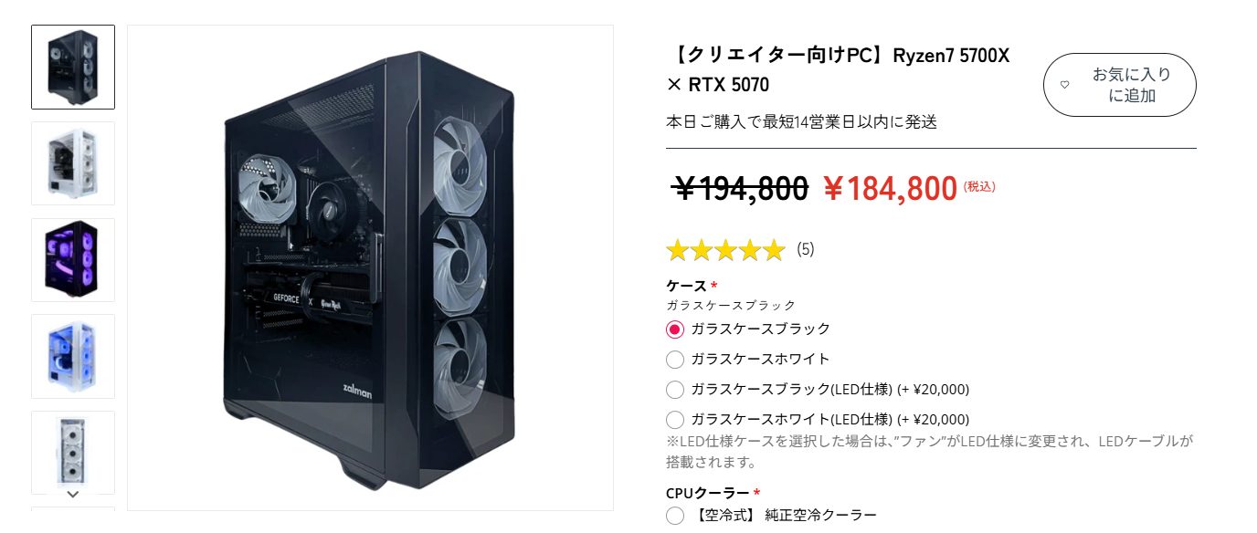 Ryzen 7 5700Xと強力なRTX 5070を搭載し、高画質設定でのプレイや高リフレッシュレートの対戦環境にも対応できます 。 ゲームだけでなく、編集や配信といった用途にも余裕で応えるパフォーマンスを備えており 、「今後のゲームにも対応できる構成が欲しい」という方にもぴったりの、長く使えるバランス型PCです 。