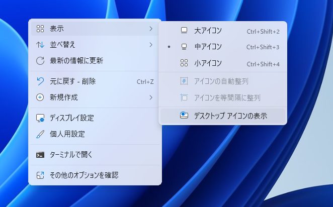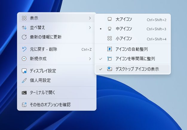デスクトップアイコンを隠す方法は、右クリックの「表示」メニューから一瞬で切り替えられると覚えておけばOKです。