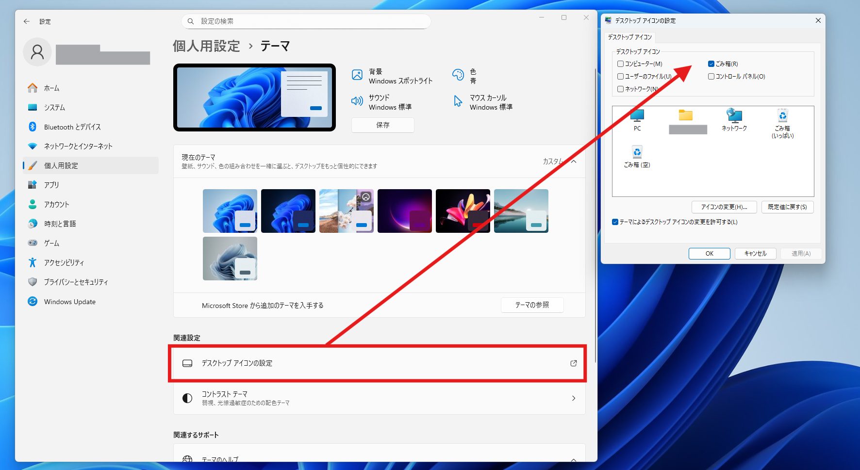 (Windows 11の場合)関連設定の中にある「デスクトップ アイコンの設定」をクリックします。 (Windows 10の場合)右側にある「デスクトップ アイコンの設定」をクリックします。